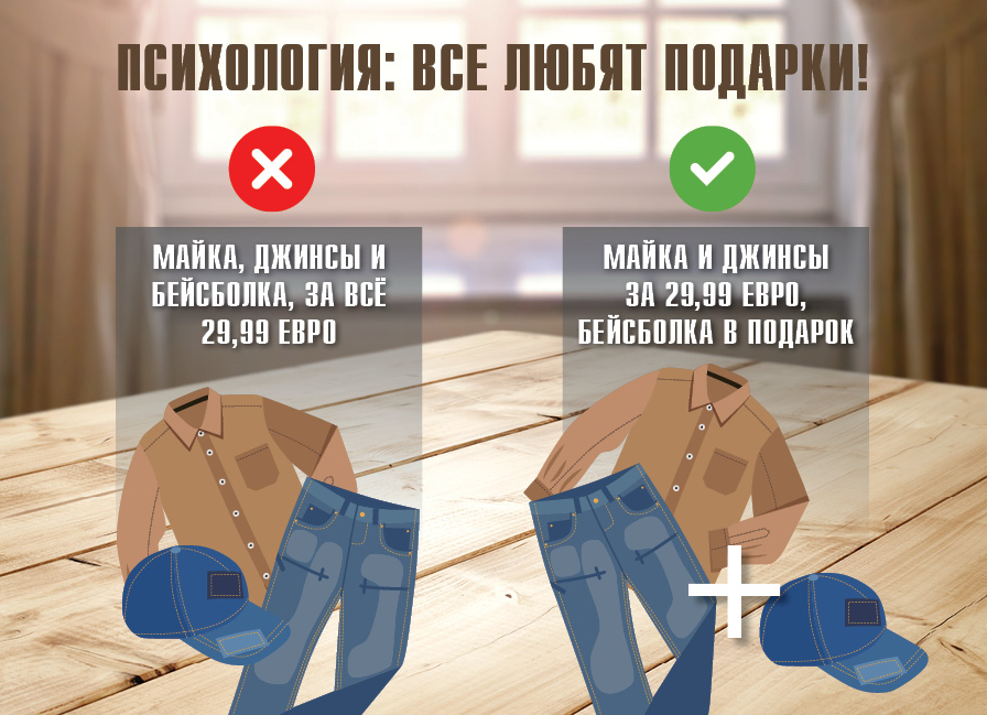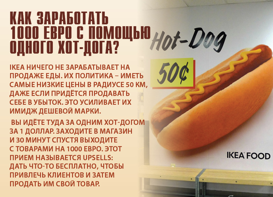 Вы идете туда за одним хот-догом за 1 доллар. Заходите в магазин и 30 минут спустя выходите с товарами на 1000 евро. Этот прием называется upsells: дать что-то бесплатно, чтобы привлечь клиентов и затем продать им свой товар.