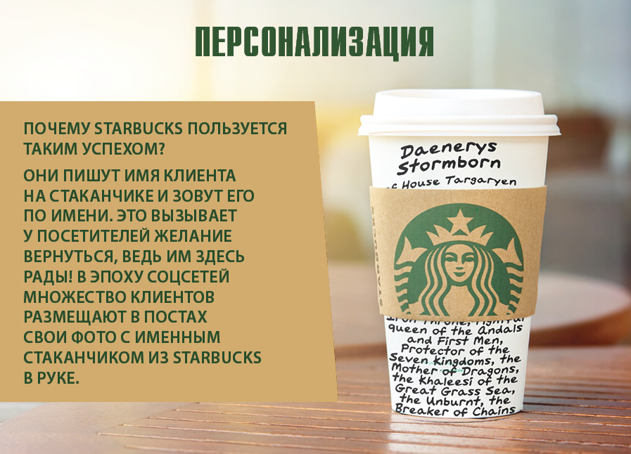 Они пишут имя клиента на стаканчике и зовут его по имени. Это вызывает у посетителей желание вернуться, ведь им здесь рады! В эпоху соцсетей множество клиентов размещают в постах свои фото с именным стаканчиком из Starbucks в руке.