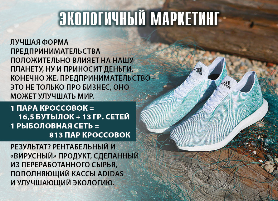 Результат? Рентабельный и «вирусный» продукт, сделанный из переработанного сырья, пополняющий кассы Adidas и улучшающий экологию.