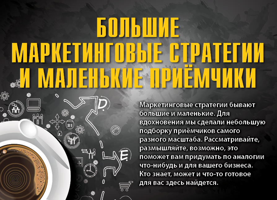Маркетинговые стратегии бывают большие и маленькие. Для вдохновения мы сделали небольшую подборку приемчиков самого разного масштаба. Рассматривайте, размышляйте, возможно, это поможет вам придумать по аналогии что-нибудь и для вашего бизнеса. Кто знает, может, и что-то готовое для вас здесь найдется.