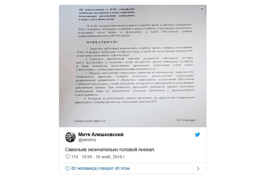 Так кратко и емко Митя Алешковский прокомментировал приказ гендиректора «Аэрофлота»