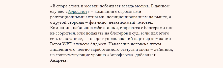 Реакция «Аэрофлота» была стремительной — Алешковского лишили платинового статуса в системе «Аэрофлот бонус», а его супругу — золотого. После чего он пригрозил судом, но получил намек: не стоит оскорблять руководство. Следующий ход Алешковского — извинения в адрес гендиректора и просьба восстановить статус. Но Савельев непреклонен в этом вопросе.