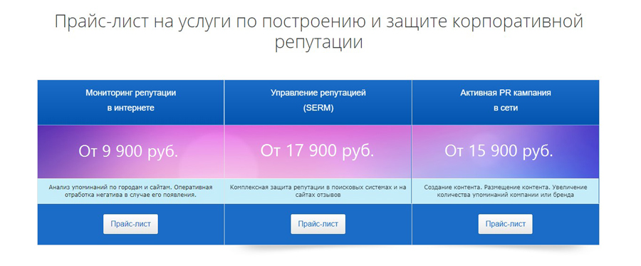 Стоимость услуг по построению и защите репутации отличается в зависимости от того, какие работы нужны. Вот ориентировочные расценки: