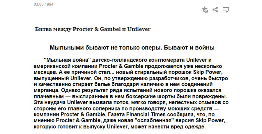 Другой пример. В 1994 году компания Procter & Gamble развернула пиар-кампанию против Unilever, производителя стирального порошка Persil Power. Все из-за того, что небольшая порция Power могла отстирать больше белья, чем Ariel.
