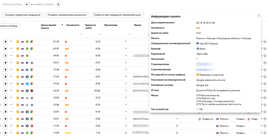 Как и в любых отчетах «Метрики», можно воспользоваться фильтрами. Например, посмотреть визиты посетителей только из рекламы «Яндекса» и только с мобильных устройств. Или визиты длительностью больше 40 секунд и только из рекламной сети Google. Насколько вашей фантазии хватит.