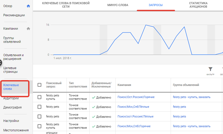 В Google поисковые запросы можно посмотреть во вкладке «Ключевые слова» — «Запросы»: