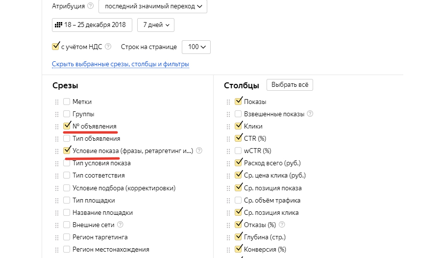 Чтобы посмотреть более детальную статистику, в срезах выделяем номер объявления (он уникальный, его легко найти) и условие показа, а в столбцах — среднюю позицию показа, среднюю позицию клика. Так мы будем знать, на каком месте показывается и кликается объявление: