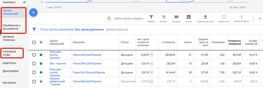 - Google: вкладки «Группы объявлений», «Объявления и расширения», «Ключевые слова» прямо в рекламном кабинете.