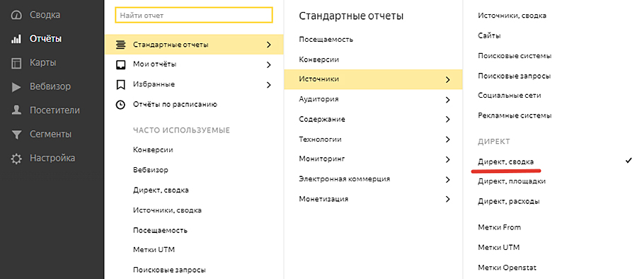 «Метрика» — «Стандартные отчеты» — «Источники» — «Директ, сводка».