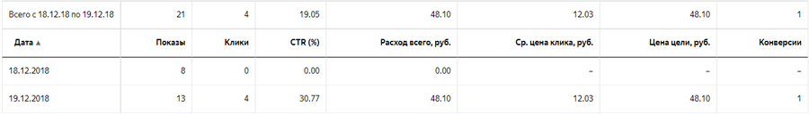 На скрине кампания не «раскликанная», по ключевым словам 1–2 клика. Но если бы было, предположим, 10–20 кликов и 0 конверсий, то для этих фраз можно попробовать переписать объявление — такое же или примерно такое, как то, что привело к конверсии.