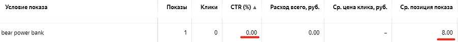 На скрине видно, что у ключевой фразы bear power bank CTR 0%. Статистики маловато, но показательна сама ситуация: средняя позиция показа 8.