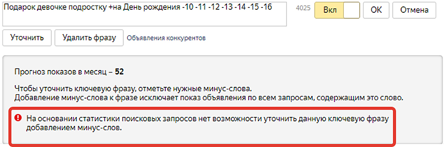Если частотность выше 500–600 (высокочастотный ключ), то низкий CTR может объясняться большим количеством нецелевых запросов. Чтобы не показывать объявления по этим запросам в будущем, берем высокочастотный ключ в кавычки (например: «умный кошелек»).