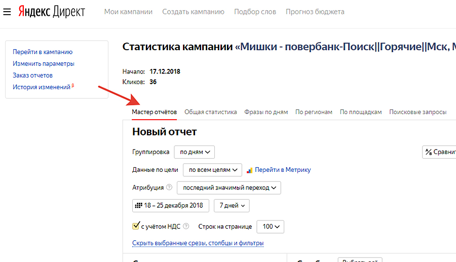 Далее в «Мастере отчетов» смотрим, какие ключевые фразы набрали много кликов, но не дали конверсий.