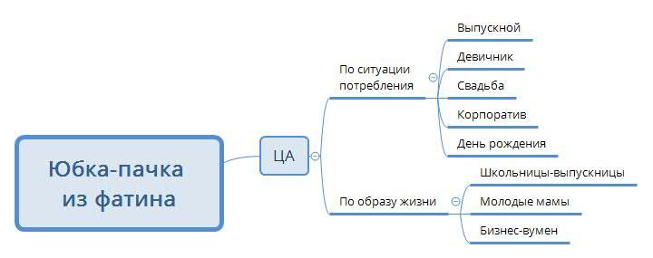 Например, для продукта «пошив женских юбок-пачек из фатина» сегментация ЦА (девушки и женщины от 18 до 45 лет, которые следят за веяниями в моде) может выглядеть так: