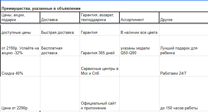 В таблице Excel расписать, что предлагается в объявлении, а что предлагается на сайте:
