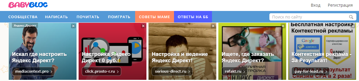 Например, меня постоянно «догоняет» реклама о предложении настроить «Яндекс.Директ». Даже на «мамском» сайте.