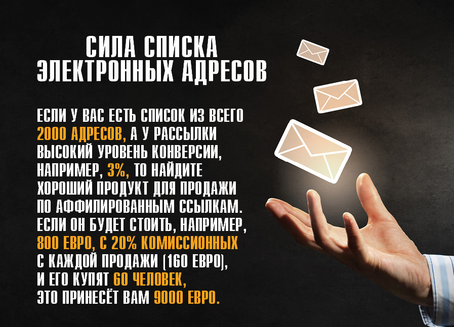 Если у вас есть список всего из 2000 адресов, а у рассылки высокий уровень конверсии, например 3%, то найдите хороший продукт для продажи по аффилированным ссылкам. Если он будет стоить, например, 800 евро с 20% комиссионных с каждой продажи (160 евро), то его купят 60 человек, это принесет вам 9000 евро.