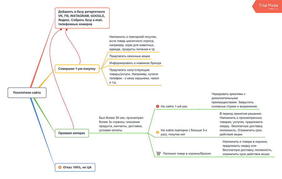 Планировать сценарии удобно в интеллект-картах. На рисунке показаны самая простая схема сегментации и типовые сценарии ремаркетинга.