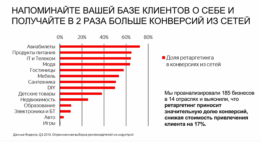Например, исследования «Яндекса» показывают, что благодаря ретаргетингу можно снизить стоимость привлечения клиента и увеличить продажи.