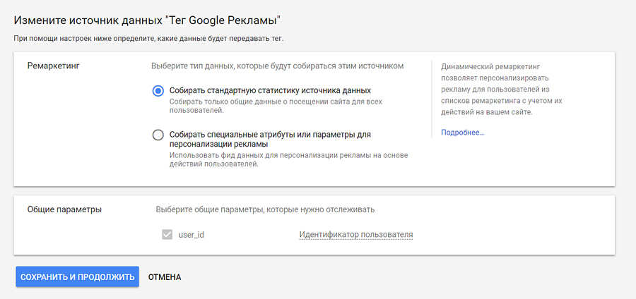 Если у вас стандартный блог или вы не планируете использовать динамический ремаркетинг, выбирайте сбор стандартной статистики источника данных. В остальных случаях настраивайте тег под свои потребности.