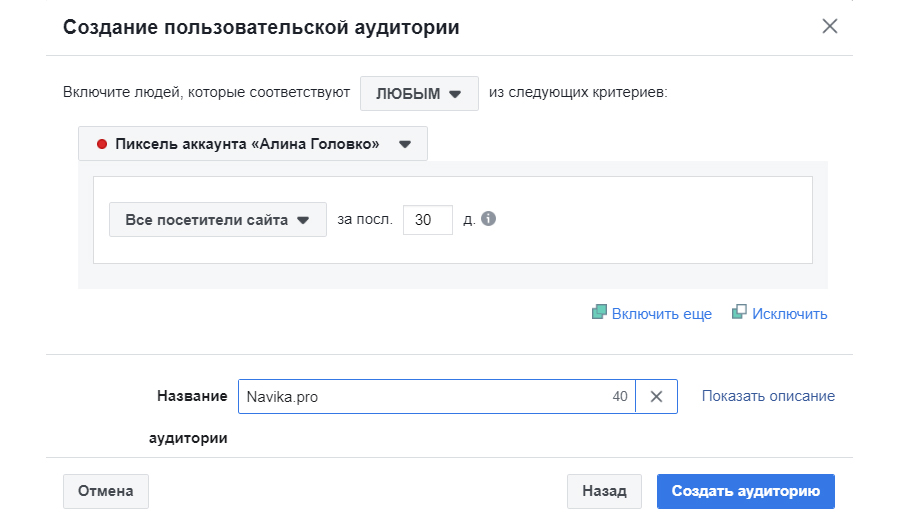В РК «Фейсбука», так же как и во «ВКонтакте», на основании одного пикселя можно создать несколько аудиторий с разными правилами. Отличие — можно добавлять параметры, по которым пользователи исключаются из базы.