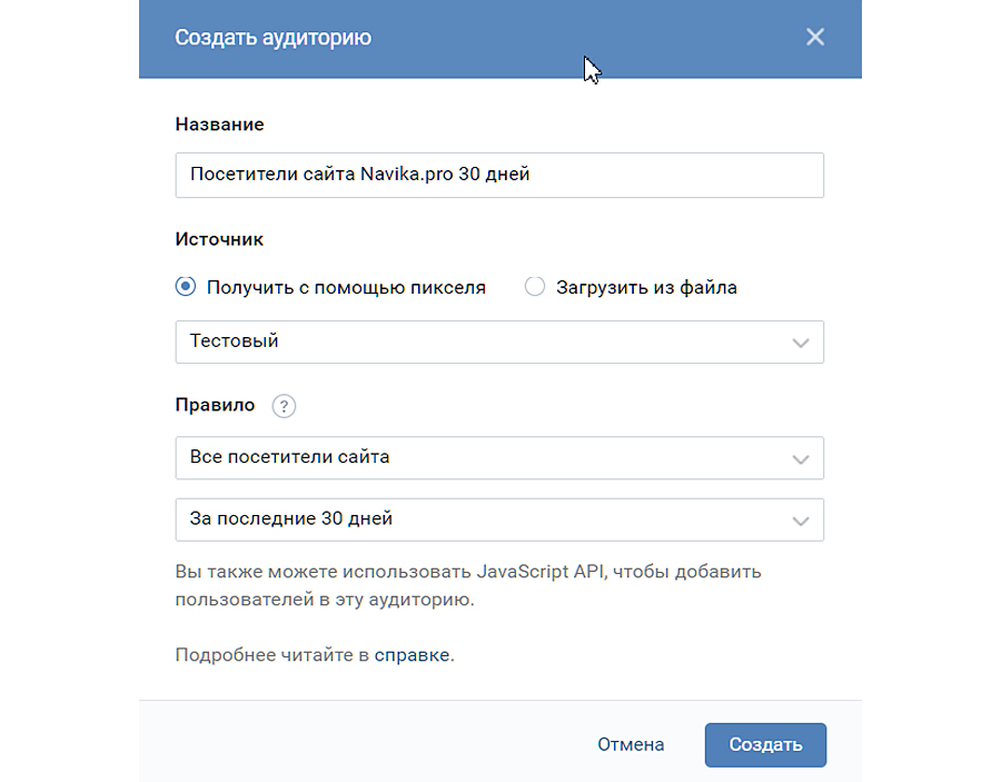 - Перейти в «Аудитории» и создать новую, источником для которой станет созданный вами пиксель.