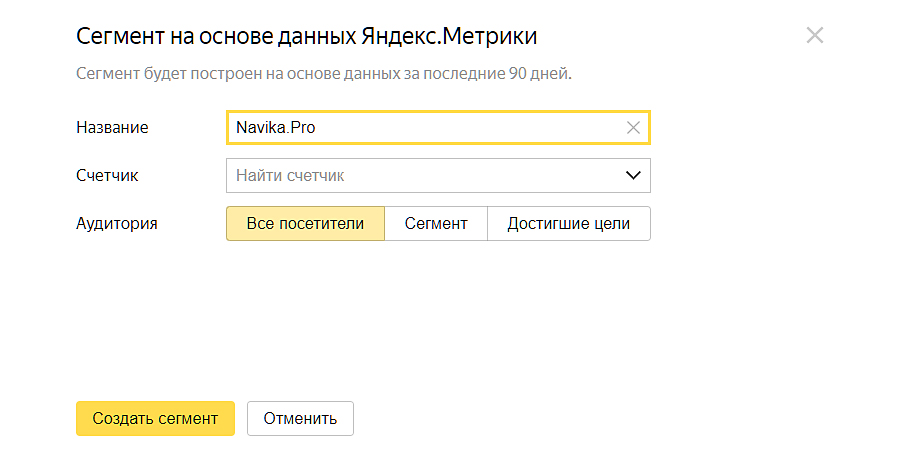 Далее, чтобы создать базу ремаркетинга для «Я.Директа», перейдите в сервис «Яндекс.Аудитории» и создайте в нем новый сегмент на основе данных из «Я.Метрики».