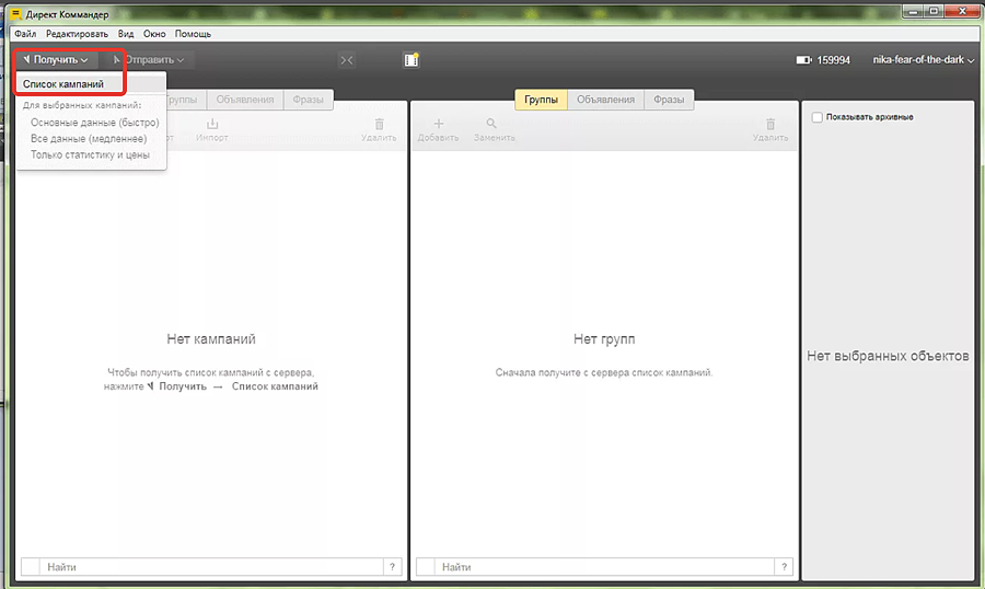 - Когда вы заходите в программу первый раз, окно «Коммандера» будет пустое, так как информацию с сервера вы еще не загрузили. Нажмите на кнопку «Получить» и выберите «Список кампаний». Все кампании, которые есть в вашем рекламном кабинете, загрузятся в программу.