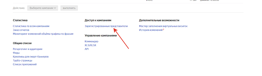 - Спуститесь в самый низ рекламного кабинета и найдите строку «Зарегистрированные представители».