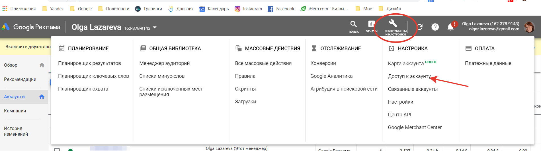 - На верхней панели найдите окошко «Инструменты и настройки», далее — «Доступ к аккаунту».