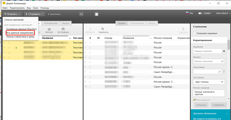 - Выберите все кампании и нажмите «Получить» — «Все данные (медленнее)».