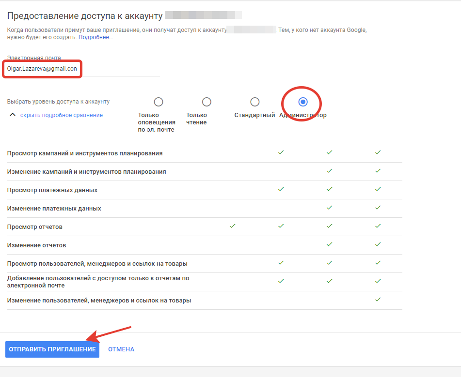 Нужно вставить адрес электронной почты сотрудника и выбрать «Разрешения». Все уровни разрешений подробно прописаны. Выбор надо делать внимательно и ответственно, от уровня разрешения зависит безопасность вашего аккаунта.