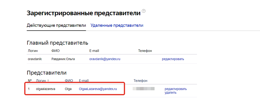 После окончания работ можете удалить представителя из вашего аккаунта.