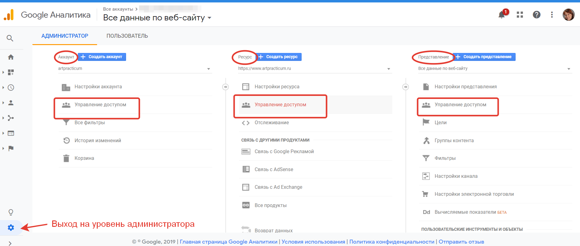 Доступ к аккаунту «Google Аналитики» предоставляется также с использованием аккаунта Google. Для этого переходим в режим администратора (шестеренка в нижнем левом углу).