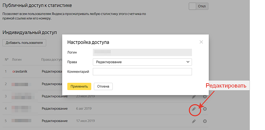 - В «Метрике» можно дать два вида прав — только просмотр или редактирование. Выбирайте уровень прав в соответствии с задачами, которые будет решать сотрудник. Уровень прав всегда можно изменить, если нажать на значок «Редактировать» у данного сотрудника.