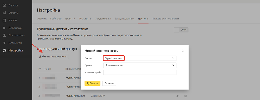- Если вы даете доступ только для «Яндекс.Метрики» (например, для SEO-специалиста), то вводите логин этого сотрудника (он должен его вам прислать).