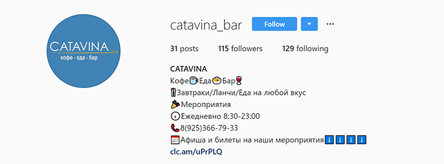 Вернемся к ресторану CATAVINA. Посмотрим на оформление профиля в «Инстаграме». Это своего рода визитка — центральное сообщение аудитории.