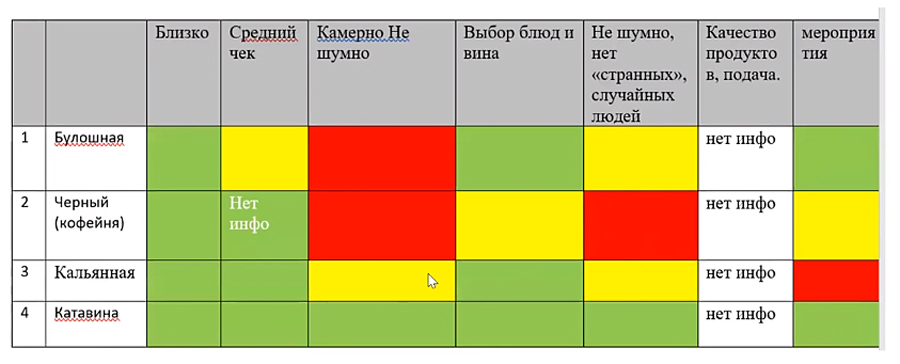 Выписываем все наши критерии выбора и прогоняем по ним сообщения конкурентов (то, как о себе рассказывают). Обязательно нужно «испытать продукт на себе»: как ведут себя официанты, освещение, уровень шума и т.п.