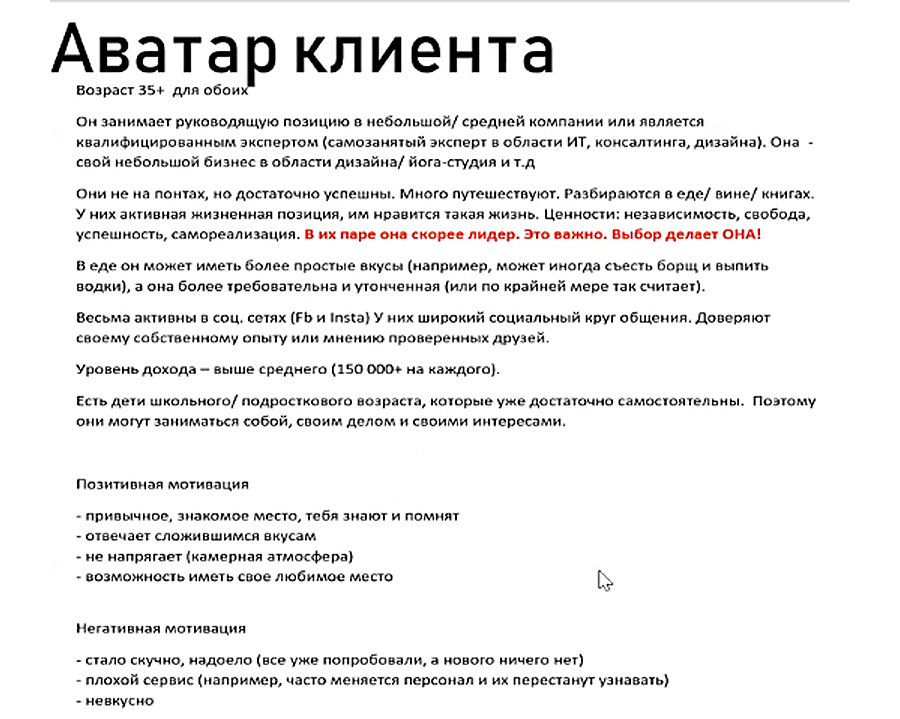 Определились с ядром ЦА: парочки. Для бизнеса этот сегмент в приоритете: выше средний чек, чаще ужинают вне дома. Остальные сегменты мы не отметаем, но работать начинаем с приоритетным.
