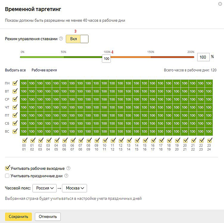 Включаем «Режим управления ставками» (3) и при помощи «бегунка» (4) выставляем корректировку. На различные дни недели и различное время можно вносить разные корректировки. Это удобно, если вы хотите показывать рекламу, например, только в рабочее время или только в вечерние часы.