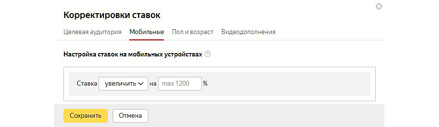Зависит от тех данных, которые вы получили при анализе отчета по устройствам в «Яндекс.Метрике». В разделе «Мобильные» ставку можно снижать или повышать до 1200%.
