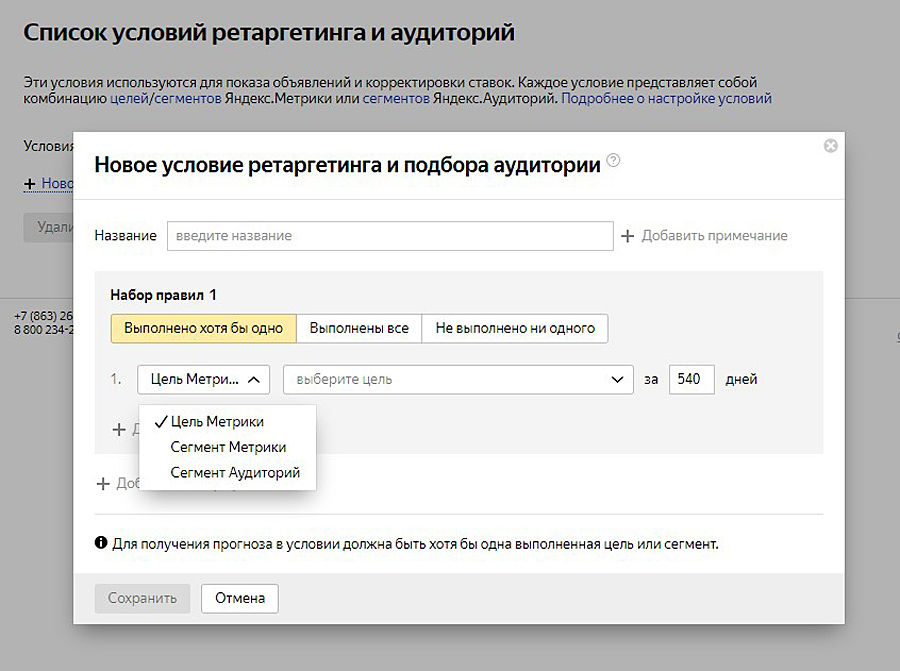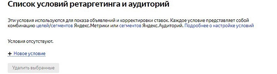В выпадающем окошке нажимаем «Новое условие» и выбираем ту цель или тот сегмент аудитории, которые вы предварительно настроили в «Яндекс.Метрике».