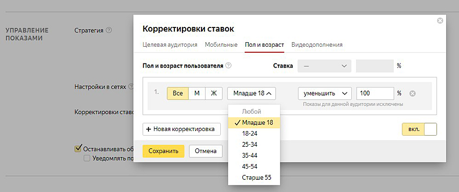 Например, если вы хотите исключить показ ваших рекламных объявлений лицам моложе 18 лет, то в разделе «Параметры» рекламной кампании выбираете раздел «Корректировка ставок», «Пол и возраст» и в настройках «Все», «Младше 18», «уменьшить», «100%». Сохраняете изменения.