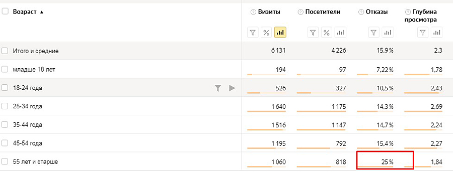 Анализируем процент отказов. Если в какой-то возрастной категории этот показатель выше (то есть пользователи чаще уходят с сайта), то снижаем ставки и ограничиваем показы для данной категории пользователей.