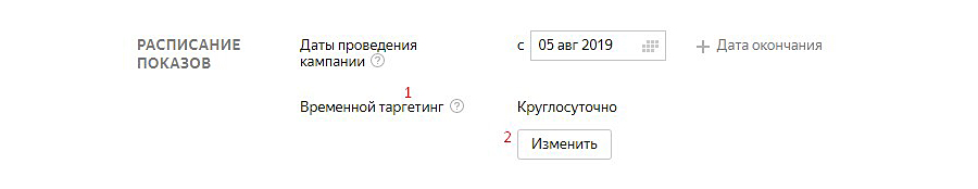 В разделе «Параметры» рекламной кампании выбираем «Временной таргетинг» (1), «Изменить» (2).