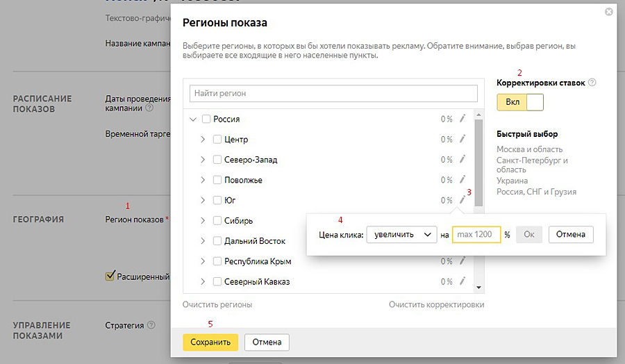 В разделе «Параметры» рекламной кампании выбираем «Регион показов» (1), включаем «Корректировка ставок» (2), нажимаем на «карандашик» напротив нужного региона или города (3), корректируем ставку (4) и сохраняем (5).