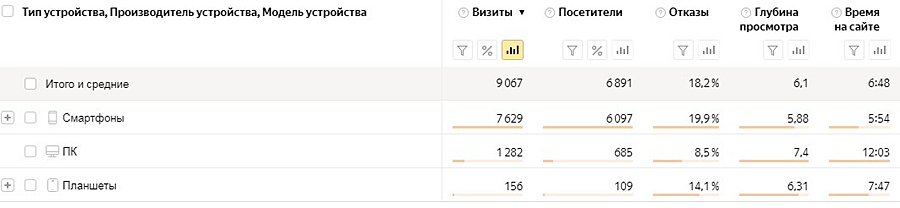 Таким же образом анализируем отчеты по видам устройств и другим характеристикам.