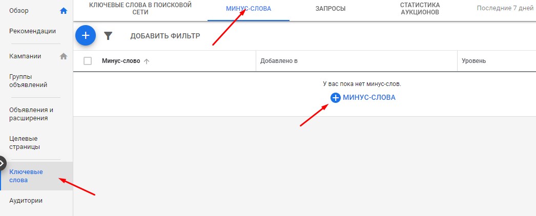 Минус-слова добавляются во вкладке «Минус-слова» в разделе «Ключевые слова».