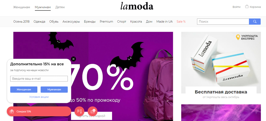 Пример Lamoda. Всплывающее окно, частично перекрывающее контент, но не препятствующее взаимодействию