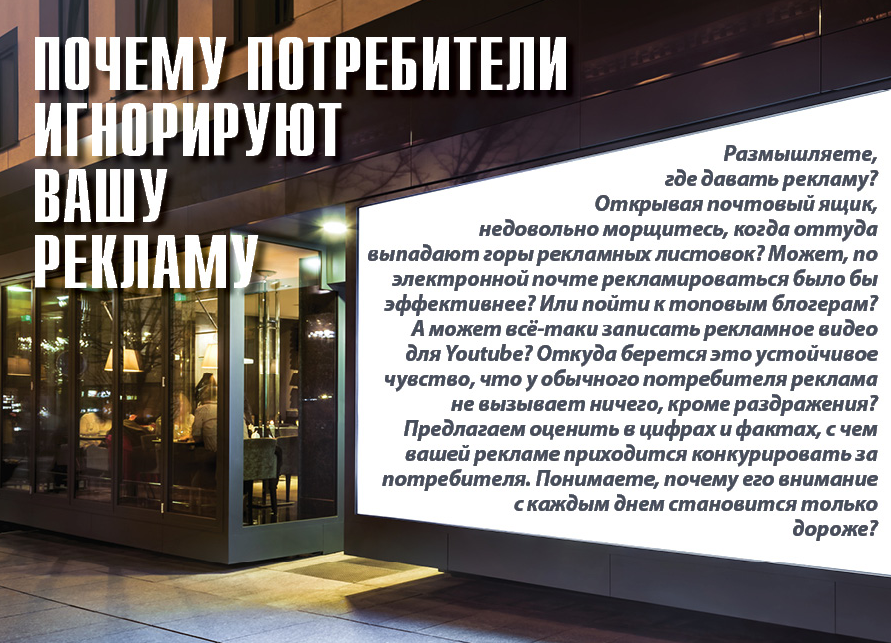 Предлагаем оценить в цифрах и фактах, с чем вашей рекламе приходится конкурировать за потребителя. Понимаете, почему его внимание с каждым днем становится только дороже?